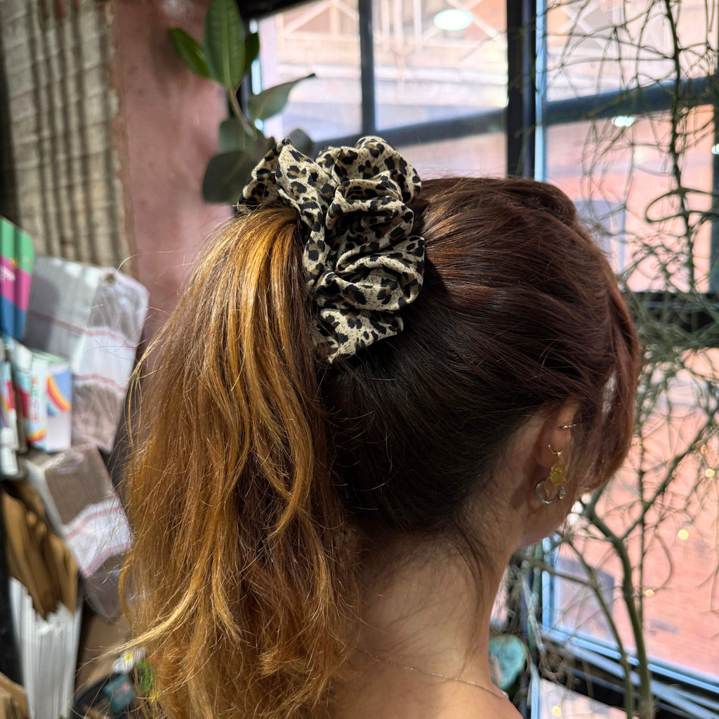Soft oversized scrunchie in floral, leopard, and dotted patterns, perfect for stylish everyday hair looks.